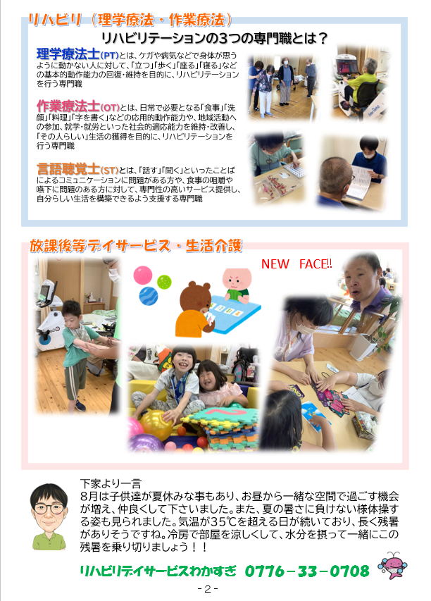 福井市若杉を拠点にリハビリ専門通所介護事業・障害福祉サービス事業・訪問看護事業を提供しております。