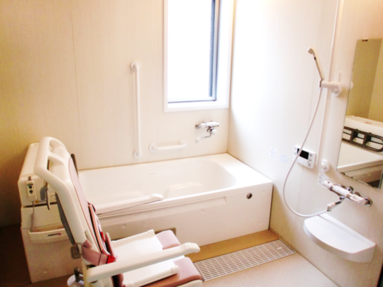 自力で歩くのが難しい方は、入浴用車椅子を使って入浴。軽い力で簡単に操作できる構造なので、介助する方もひとりでラクに安心して入浴介助が行えます。