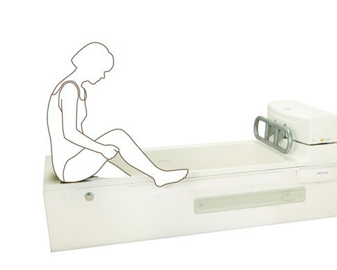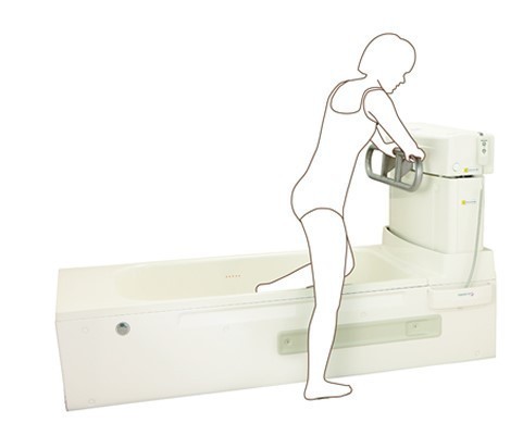 立位での片足立ち動作が不安定な方は、浴槽縁に座って入浴。リフトを使わない直接入浴なので、家庭の浴槽と同じ感覚で入浴できます。